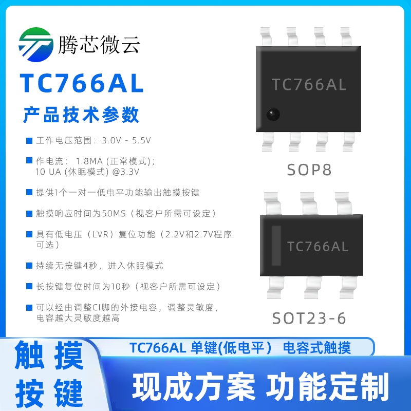 作电流: 1.8mA (正常模式);10 uA (休眠模式) @3.3V·提供1个一对一低电平功能输出触摸按键